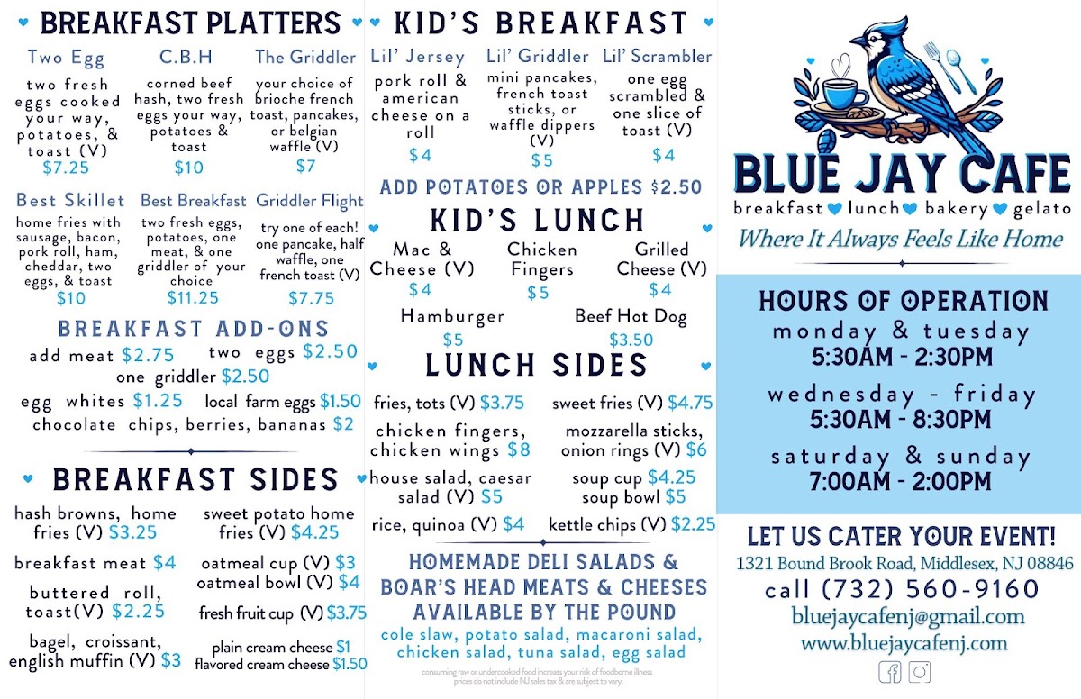 Welcome to Blue Jay Cafe, a delightful gem nestled in Middlesex, NJ, where food meets warmth and community spirit! Located at 1321 Bound Brook Rd, this cafe is the heart and soul of local dining, offering an inviting atmosphere paired with a menu that celebrates fresh and quality ingredients.